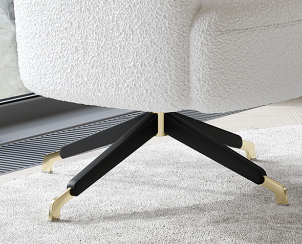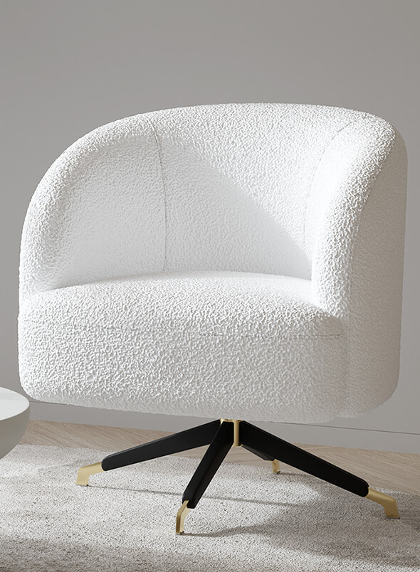 Designul fotoliului Cotton mizează pe forme organice și proporții echilibrate. Spătarul rotunjit și brațele fluide creează o siluetă prietenoasă, care completează armonios un living, un dormitor generos sau un birou de inspirație contemporană. Baza metalică rotativă adaugă un detaliu grafic subtil, completat cu accente aurii care dau profunzime și stil.